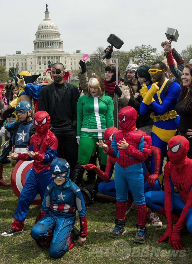 【4月20日 AFP】米ワシントンD.C.(Washington D.C.)で18日、コミックのキャラクターに扮した人たちの参加人数で競い合う世界最大のイベントが行われ、米国会議事堂の前にはスーパーマン(Supermen)やキャプテン・アメリカ(Captain America)の衣装を着た人たちが集まった。しかし、ぴっちりしたタイツを身に着ける度胸と超人的パワーを持ってしても、世界記録の更新は果たせなかった。