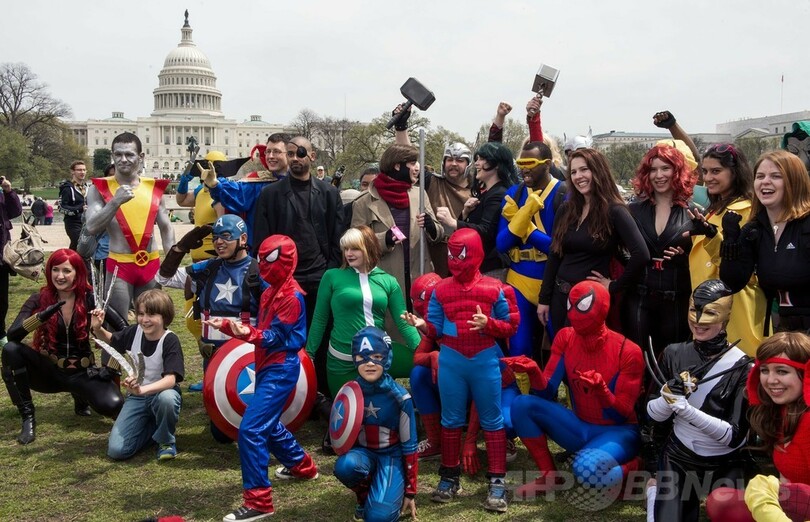【4月20日 AFP】米ワシントンD.C.(Washington D.C.)で18日、コミックのキャラクターに扮した人たちの参加人数で競い合う世界最大のイベントが行われ、米国会議事堂の前にはスーパーマン(Supermen)やキャプテン・アメリカ(Captain America)の衣装を着た人たちが集まった。しかし、ぴっちりしたタイツを身に着ける度胸と超人的パワーを持ってしても、世界記録の更新は果たせなかった。