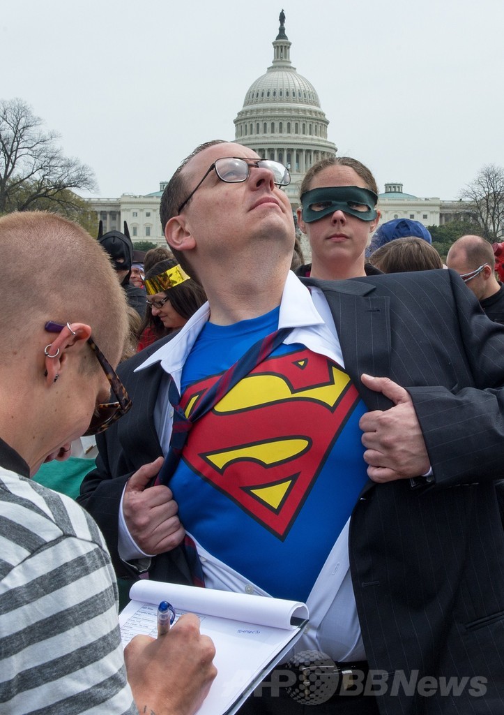 【4月20日 AFP】米ワシントンD.C.(Washington D.C.)で18日、コミックのキャラクターに扮した人たちの参加人数で競い合う世界最大のイベントが行われ、米国会議事堂の前にはスーパーマン(Supermen)やキャプテン・アメリカ(Captain America)の衣装を着た人たちが集まった。しかし、ぴっちりしたタイツを身に着ける度胸と超人的パワーを持ってしても、世界記録の更新は果たせなかった。