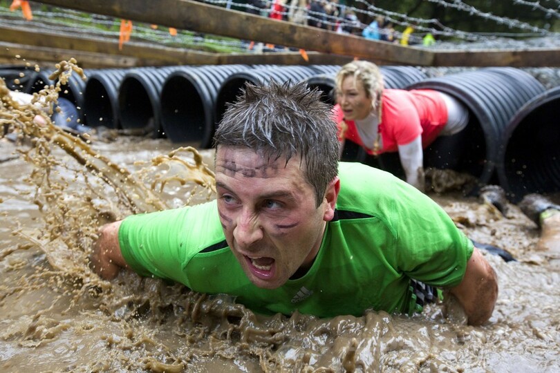 コースは18~20キロにわたり、20個の障害物が設けられた。参加者らは体力と精神力の限りを尽くし、絶壁をよじ登ったり、水に飛び込んだり、ぬかるんだ丘を駆け上がったりしながらゴールを目指した。(c)AFP