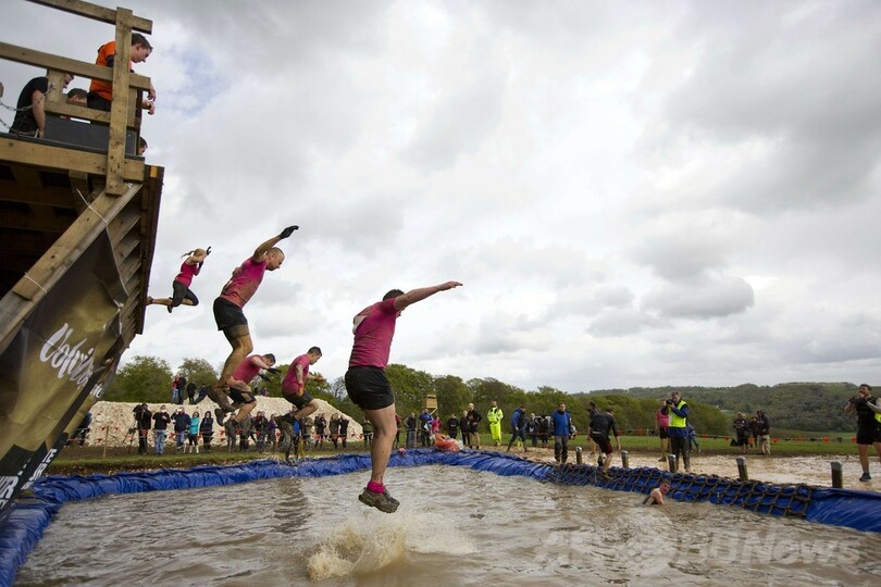 【4月27日 AFP】ロンドン(London)の西に位置するヘンリーオンテムズ(Henley on Thames)で26日、耐久障害物競争「タフマダー(Tough Mudder)」が開催された。
