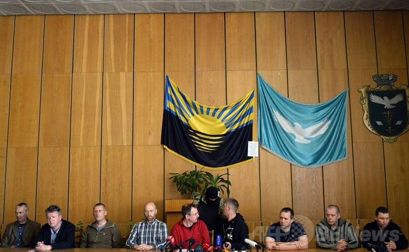 【4月28日 AFP】ウクライナ東部スラビャンスク(Slavyansk)の親ロシア派武装勢力は27日、拘束した欧州安保協力機構(OSCE)軍事監視団のメンバーらを「戦争捕虜」として記者会見に同席させた。