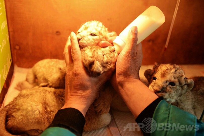 【4月30日 AFP】中国東部山東(Shandong)省青島(Qingdao)にある動物園、「青島森林野生動物世界(Qingdao Forest Wildlife World)」で28日、ミルクを飲む赤ちゃんライオンの姿がカメラに収められた。同施設では先週、ライオンの赤ちゃんが5匹生まれた。(c)AFP