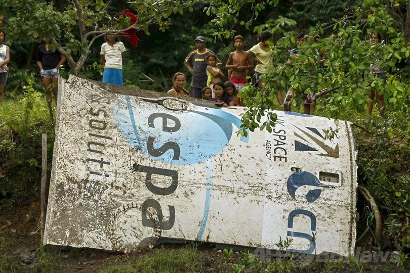 破片には、英宇宙局(UK Space Agency)と欧州の商業用ロケット打ち上げ会社アリアンスペース(Arianespace)のロゴが描かれており、近接するフランス領ギアナのクールー(Kourou)にある欧州宇宙機関(European Space Agency、ESA)の宇宙基地から打ち上げられた宇宙船のものとみられている。(c)AFP