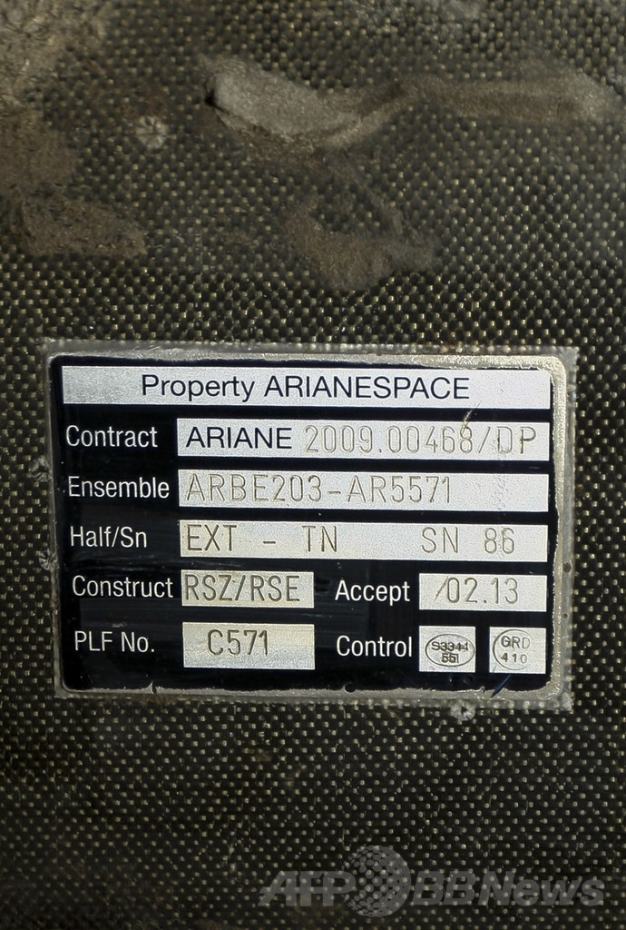 破片には、英宇宙局(UK Space Agency)と欧州の商業用ロケット打ち上げ会社アリアンスペース(Arianespace)のロゴが描かれており、近接するフランス領ギアナのクールー(Kourou)にある欧州宇宙機関(European Space Agency、ESA)の宇宙基地から打ち上げられた宇宙船のものとみられている。(c)AFP