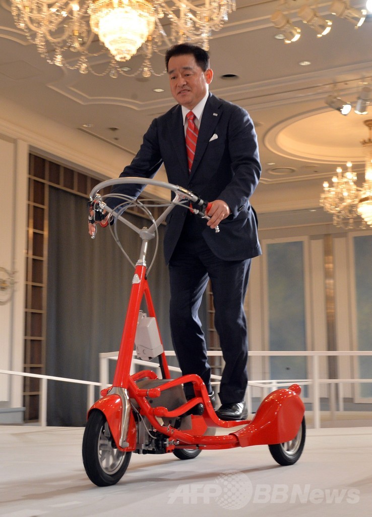 【4月30日 AFP】(一部更新)自動車部品メーカーの片山工業(Katayama Kogyo)は30日、電動アシスト機能を備えた立ち乗り型の三輪車「ウォーキングバイシクル(Walking Bicycle)」を公開した。ペダルを歩くように踏むことで進むのが特徴のウォーキングバイシクルは、最高時速25キロで走行可能。価格は29万円の予定で、10月に発売される予定。(c)AFP