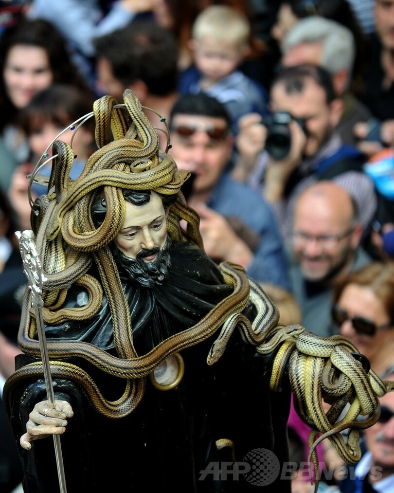 ニュース ライフ 「ヘビの聖人」が街を行進、伊コクッロの伝統祭 2014年5月2日 12:45 発信地:コクッロ/イタリア [ ヨーロッパ イタリア ] このニュースをシェア ‹ › ❮ 18/24 ❯ イタリア・アブルツォ(Abruzzo)州のコクッロ(Cocullo)で行われた伝統のヘビ祭りで、街を練り歩くヘビに覆われた聖人像(2014年5月1日撮影)。(c)AFP/TIZIANA FABI 画像作成中 ! 【5月2日 AFP】イタリア・アブルツォ(Abruzzo)州のコクッロ(Cocullo)で1日、毎年恒例のヘビ祭りが行われ、ヘビに覆われた聖人の像が街を練り歩いた。(c)AFP ライフ 一覧へ> メディア・報道関係・法人の方向け 写真・動画 購入のお問合せ>