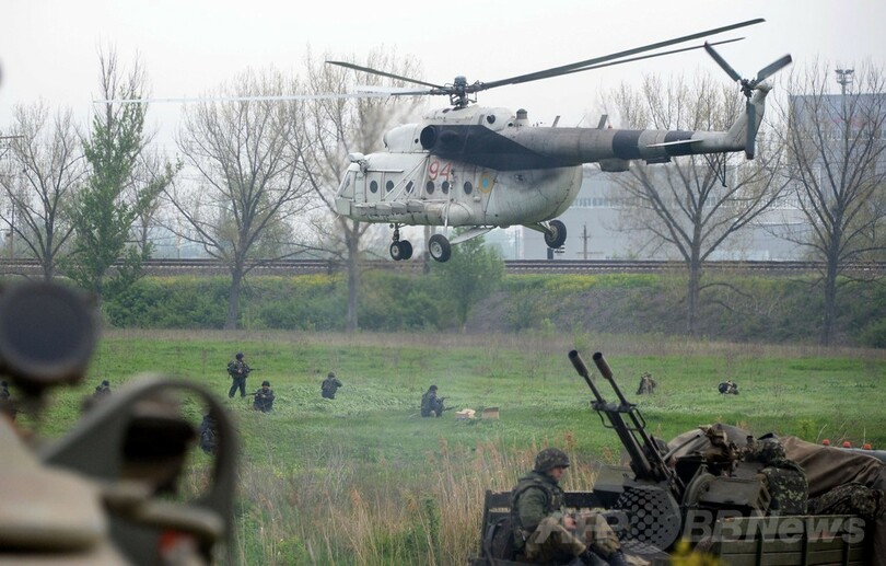【5月2日 AFP】(写真追加)ウクライナ軍は2日、親ロシア派の武装集団が掌握する東部スラビャンスク(Slavyansk)の奪還作戦を開始した。しかし、ウクライナ暫定政権によると軍のヘリコプター2機が親ロシア派の携行式ロケット弾攻撃により撃墜され、兵士2人が死亡したという。
