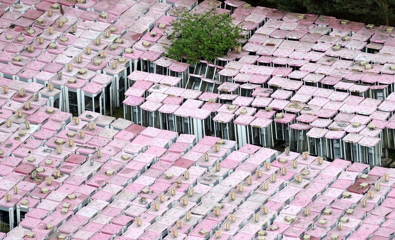 【5月3日 AFP】ドイツ東部ミシェンドルフ(Michendorf)で1日、同国の通信大手ドイツテレコム(Deutsche Telekom)が撤去・回収した電話ボックス約3000基が並ぶ保管区域を上空から捉えた。