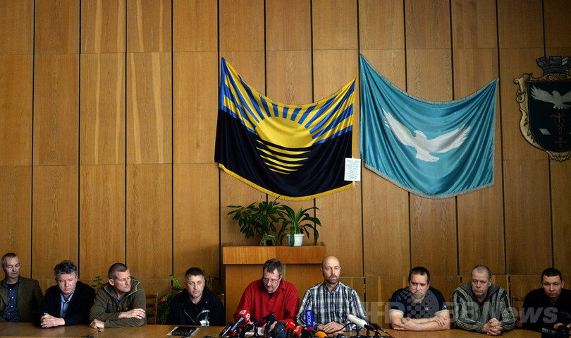 【5月3日 AFP】(一部更新、写真追加)ウクライナ東部のスラビャンスク(Slavyansk)で先月25日に親ロシア派によって拘束されていた欧州安保協力機構(OSCE)の監視員7人と付き添っていたウクライナ軍の5人が3日、解放された。