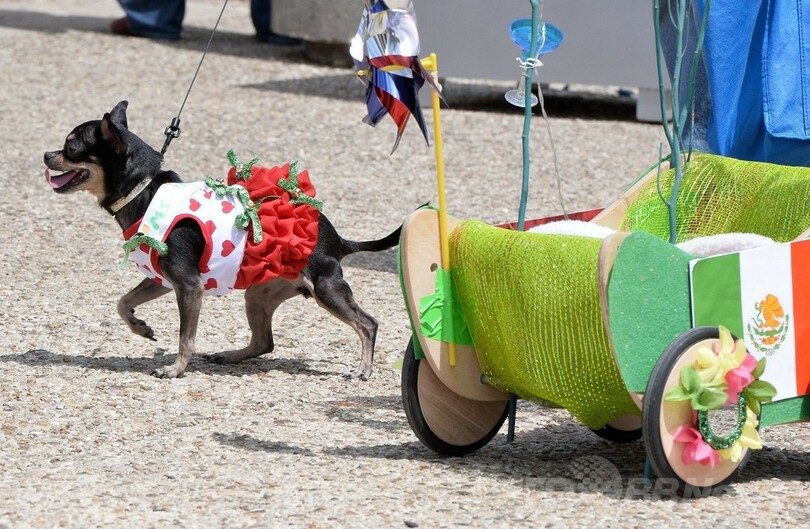 【5月4日 AFP】米ワシントンD.C.(Washington D.C.)で3日、毎年恒例の「ラン・オブ・ザ・チワワ(Run of the Chihuahuas)」が開催され、大勢のチワワの飼い主たちが着飾らせた自慢の愛犬を連れて参加した。同レースは5日のメキシコの祝日「シンコ・デ・マヨ(Cinco de Mayo)」を記念して行われている。(c)AFP