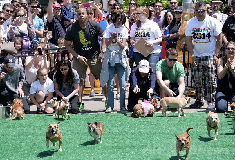 【5月4日 AFP】米ワシントンD.C.(Washington D.C.)で3日、毎年恒例の「ラン・オブ・ザ・チワワ(Run of the Chihuahuas)」が開催され、大勢のチワワの飼い主たちが着飾らせた自慢の愛犬を連れて参加した。同レースは5日のメキシコの祝日「シンコ・デ・マヨ(Cinco de Mayo)」を記念して行われている。(c)AFP