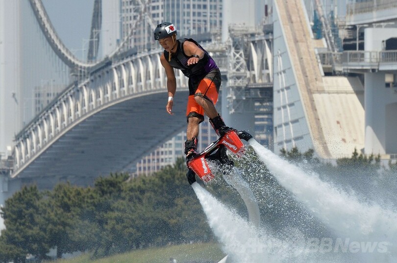 【5月5日 AFP】東京・お台場海浜公園(Odaiba Marine Park)のおだいばビーチ(Odaiba Beach)で4日、水圧を利用して空中飛行を楽しむマリンスポーツ「フライボード」の大会「フライボードチャンピオンシップ2014~お台場~(FLYBOARD CHAMPIONSHIP)」が開催された。この競技では、水上バイクとホースでつながれた「フライボード」と呼ばれる専用の器具を使ってアクロバティックな技を競う。