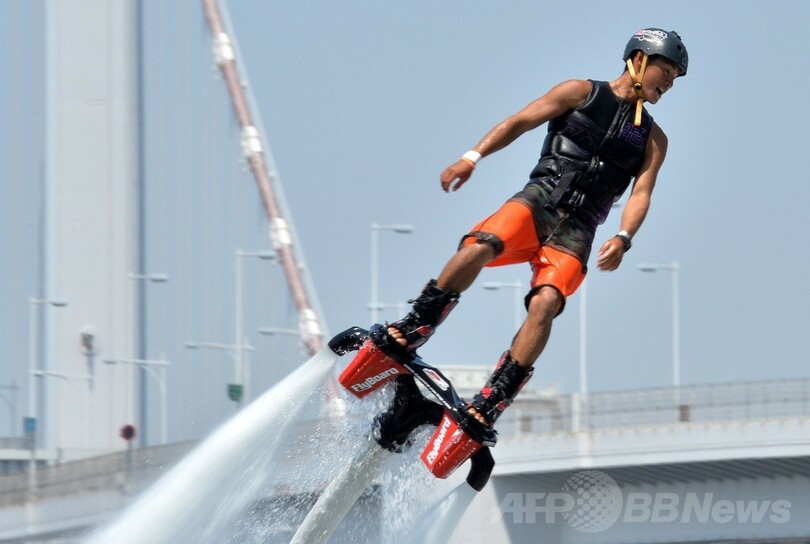 【5月5日 AFP】東京・お台場海浜公園(Odaiba Marine Park)のおだいばビーチ(Odaiba Beach)で4日、水圧を利用して空中飛行を楽しむマリンスポーツ「フライボード」の大会「フライボードチャンピオンシップ2014~お台場~(FLYBOARD CHAMPIONSHIP)」が開催された。この競技では、水上バイクとホースでつながれた「フライボード」と呼ばれる専用の器具を使ってアクロバティックな技を競う。