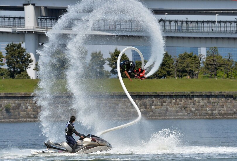 【5月5日 AFP】東京・お台場海浜公園(Odaiba Marine Park)のおだいばビーチ(Odaiba Beach)で4日、水圧を利用して空中飛行を楽しむマリンスポーツ「フライボード」の大会「フライボードチャンピオンシップ2014~お台場~(FLYBOARD CHAMPIONSHIP)」が開催された。この競技では、水上バイクとホースでつながれた「フライボード」と呼ばれる専用の器具を使ってアクロバティックな技を競う。