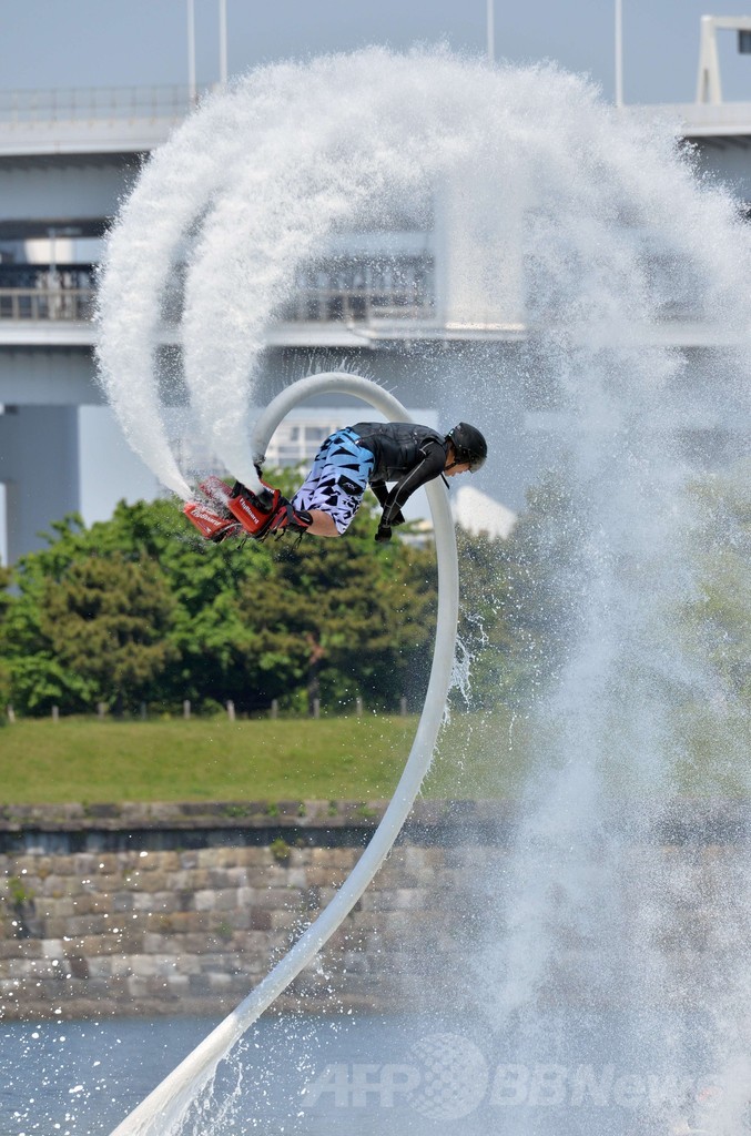 【5月5日 AFP】東京・お台場海浜公園(Odaiba Marine Park)のおだいばビーチ(Odaiba Beach)で4日、水圧を利用して空中飛行を楽しむマリンスポーツ「フライボード」の大会「フライボードチャンピオンシップ2014~お台場~(FLYBOARD CHAMPIONSHIP)」が開催された。この競技では、水上バイクとホースでつながれた「フライボード」と呼ばれる専用の器具を使ってアクロバティックな技を競う。