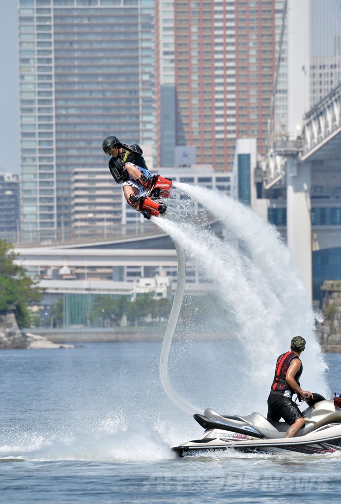 【5月5日 AFP】東京・お台場海浜公園(Odaiba Marine Park)のおだいばビーチ(Odaiba Beach)で4日、水圧を利用して空中飛行を楽しむマリンスポーツ「フライボード」の大会「フライボードチャンピオンシップ2014~お台場~(FLYBOARD CHAMPIONSHIP)」が開催された。この競技では、水上バイクとホースでつながれた「フライボード」と呼ばれる専用の器具を使ってアクロバティックな技を競う。