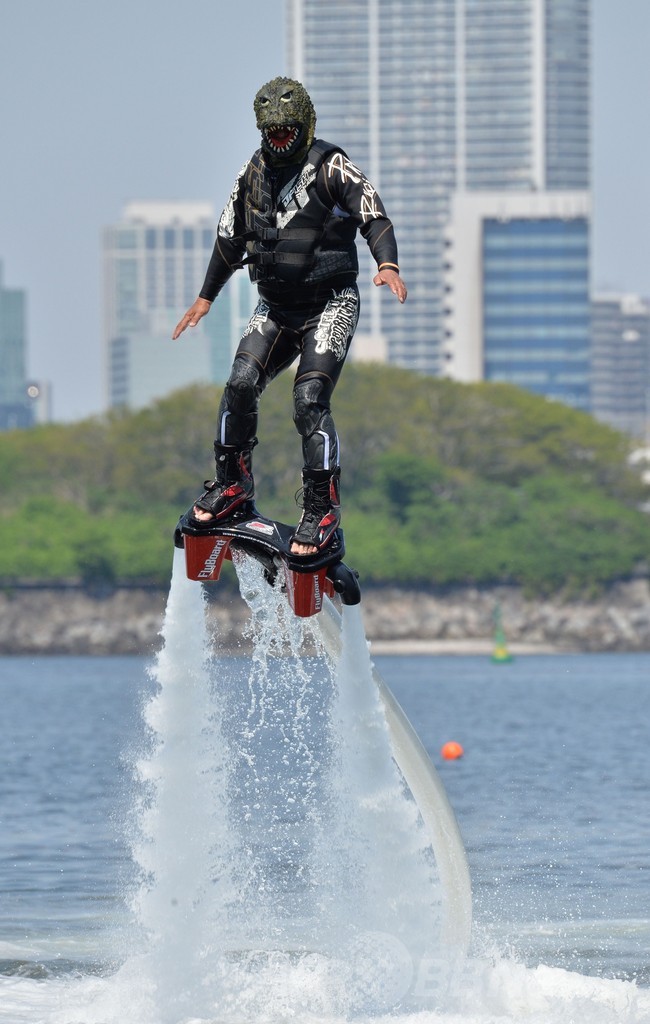 【5月5日 AFP】東京・お台場海浜公園(Odaiba Marine Park)のおだいばビーチ(Odaiba Beach)で4日、水圧を利用して空中飛行を楽しむマリンスポーツ「フライボード」の大会「フライボードチャンピオンシップ2014~お台場~(FLYBOARD CHAMPIONSHIP)」が開催された。この競技では、水上バイクとホースでつながれた「フライボード」と呼ばれる専用の器具を使ってアクロバティックな技を競う。