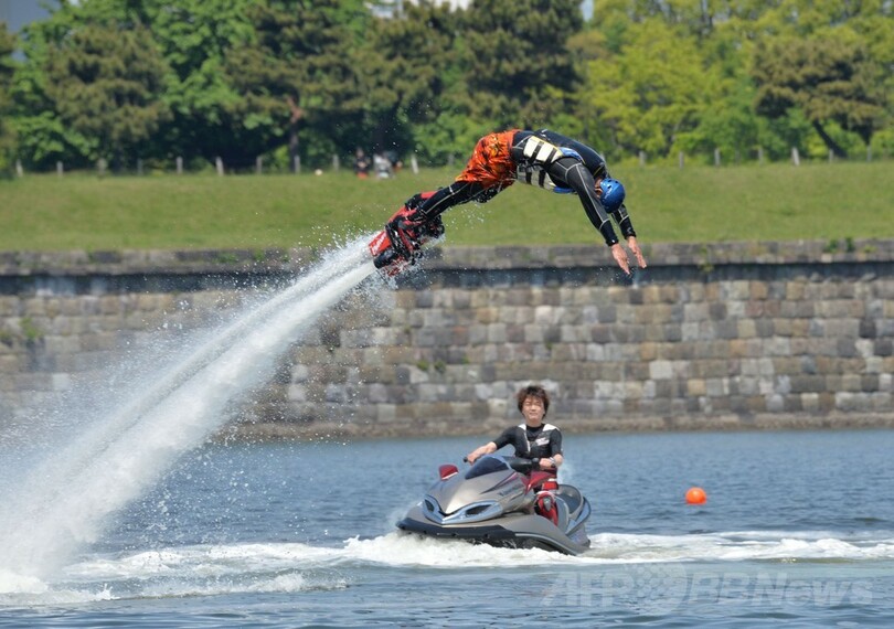【5月5日 AFP】東京・お台場海浜公園(Odaiba Marine Park)のおだいばビーチ(Odaiba Beach)で4日、水圧を利用して空中飛行を楽しむマリンスポーツ「フライボード」の大会「フライボードチャンピオンシップ2014~お台場~(FLYBOARD CHAMPIONSHIP)」が開催された。この競技では、水上バイクとホースでつながれた「フライボード」と呼ばれる専用の器具を使ってアクロバティックな技を競う。
