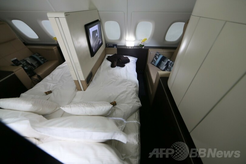 【5月6日 AFP】アラブ首長国連邦(UAE)のエティハド航空(Etihad Airways)はこのほど、今年納入予定のエアバス(Airbus)A380機の機内模型を公開し、ファーストクラスで利用できる「スイートルーム」の導入を発表した。高級志向の顧客がターゲットとして設定された新サービスでは、ホテルのような空間が提供される。(c)AFP
