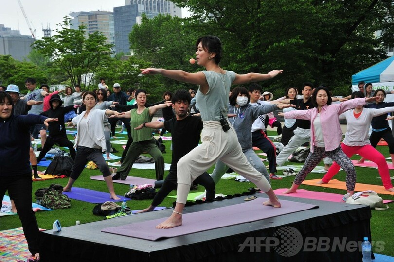 【5月5日 AFP】東京・港区の東京ミッドタウンにある芝生広場では、屋外でのヨガ教室イベント「ミッドパーク ヨガ(Midpark yoga)」が開催されている。ゴールデンウィーク中の5日には450人もの参加者が集まりヨガを楽しんだ。(c)AFP
