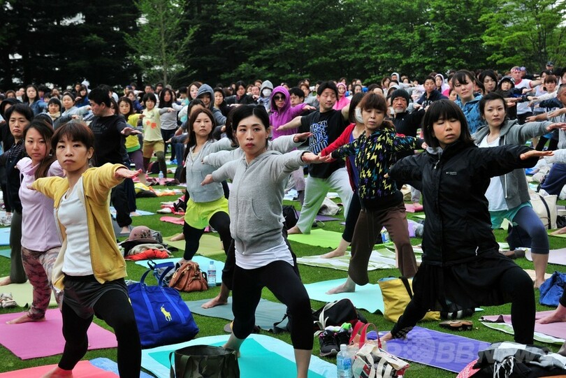屋外の芝生でヨガを楽しむイベント開催、東京・港区