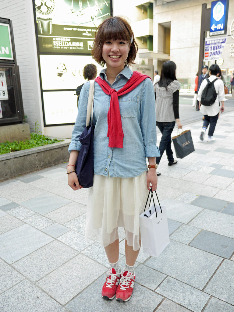日常的に履きこなしている人たちは、スタイリングに合わせてその日に履くスニーカーを選んでいる人がほとんど。おしゃれのコツは、ほかのアイテムと色を合わせたり、逆にスニーカーの色を差し色にして、ほかのアイテムと色のトーンを揃えること。普段運転することが多いためほとんど毎日スニーカーという20代会社員女性は、どんなスタイルにも合わせやすいよう紺をチョイス。また、全身黒のコーディネートに紫の「ナイキ」を合わせた20代の女性や、肩にかけたセーターと同じ赤色の「ニューバランス」を合わせた20代の会社員女性など、スニーカーをあえて目立たせるスタイルも見られた。
