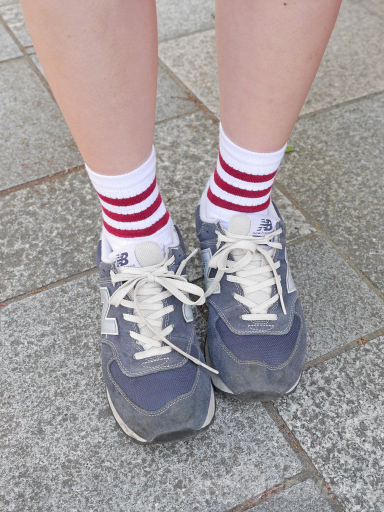 スニーカースタイルで多くの人が悩むのが、ソックスとの合わせ方。丈の長さや柄によっては古くさく見えてしまうので注意が必要だ。おしゃれ上手な人のスタイルを見てみると、プレッピーなストライプなど、あえて存在感を強調する柄物のソックスと、くるぶしソックスなどを着用して素足に見せる人とが半々に分かれた。一方全員に共通していたのが、素足を見せる部分をつくること。ジーンズなど丈の長いものはロールアップして隙間を作ると、ほどよい抜け感とこなれたスタイルを演出できる。