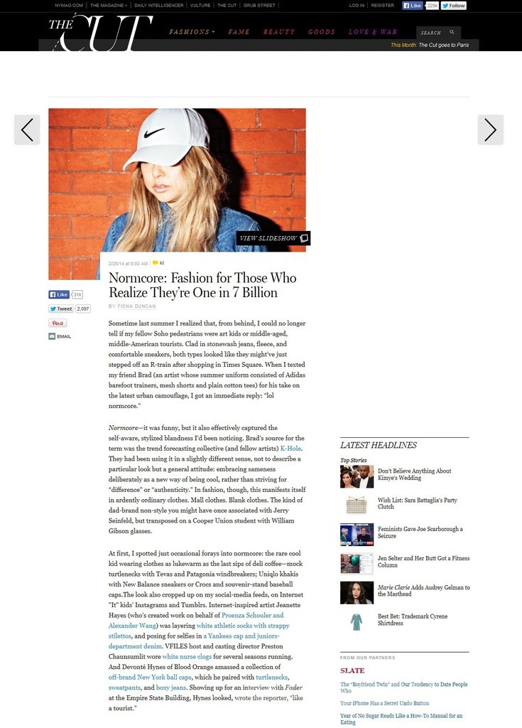 「ノームコア」はニューヨークのK-Holeというトレンド予測集団が提唱したもので、ニューヨーク在住のライター、フィオナ・ダンカンによる『ニューヨークマガジン』の記事「Normcore: Fashion for Those Who Realize They’re One in 7 Billon(自分が70億分の1であることを自覚した人のための服装)」で一気に火がつき、バズワードとなった。