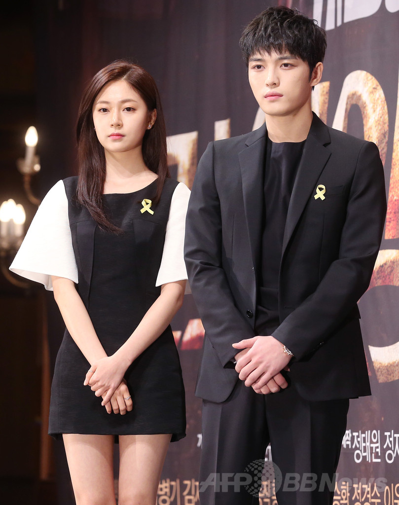 制作発表会に臨んだ出演者たちは、韓国南西部・珍島(Jindo)沖で起きた旅客船セウォル(Sewol)号の沈没事故の犠牲者に対して哀悼の意を表する黄色いリボンを胸につけて登場した。(c)STARNEWS