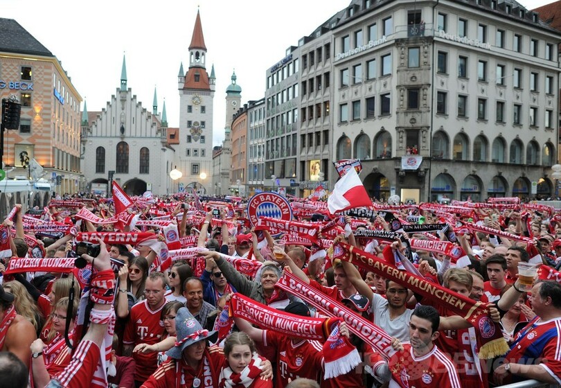 【5月11日 AFP】13-14ドイツ・ブンデスリーガ1部を制覇したバイエルン・ミュンヘン(Bayern Munich)は10日、VfBシュツットガルト(VfB Stuttgart)戦後にミュンヘン(Munich)市内で優勝パレードを行い、同市市庁舎で優勝を喜んだ。(c)AFP