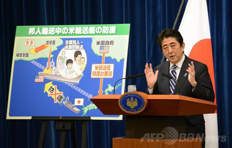 都内の首相官邸で開かれた記者会見で首相は、不穏な動きが高まる北東・東南アジア情勢を引き合いに出し、1945年以来、自衛隊が戦場で武力行使することを防いできた憲法の制約を解く必要があるとし、「しっかりと日本人の命を守ることこそが総理大臣である私の責任であると確信します」と述べた。