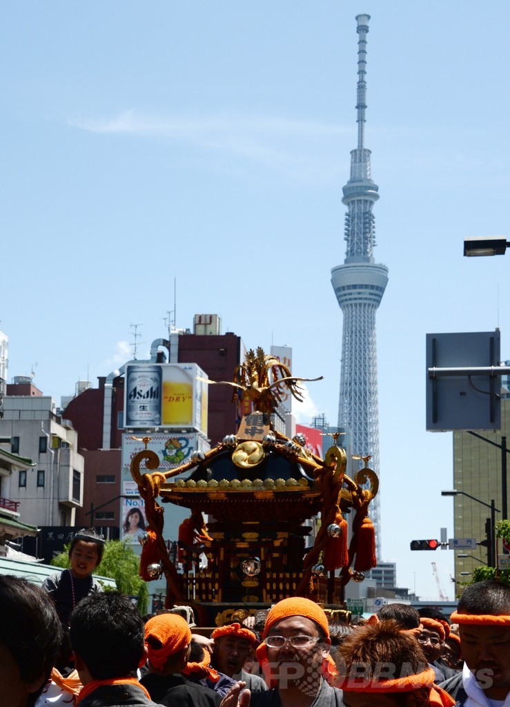 【5月18日 AFP】都内の浅草(Asakusa)では18日、初夏の訪れを告げる恒例の三社祭(Sanja festival)が最終日を迎え、界隈を練り歩くみこしを一目見ようと、大勢の観光客が詰めかけた。三社祭は東京を代表する祭りの一つで、3日間に数百万規模の人出がある。(c)AFP