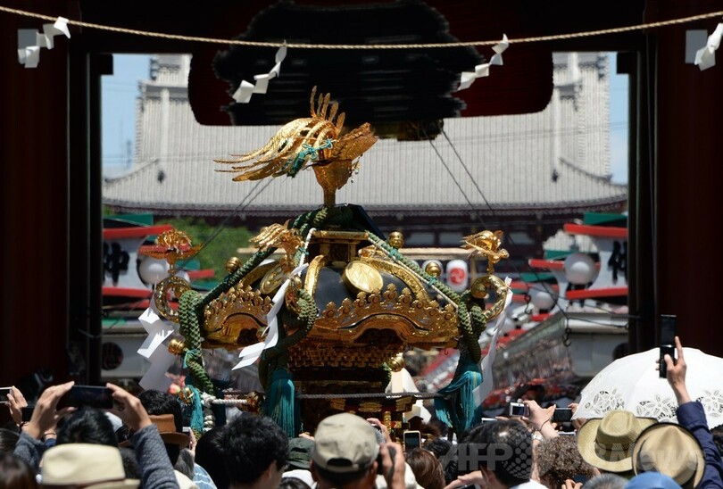 【5月18日 AFP】都内の浅草(Asakusa)では18日、初夏の訪れを告げる恒例の三社祭(Sanja festival)が最終日を迎え、界隈を練り歩くみこしを一目見ようと、大勢の観光客が詰めかけた。三社祭は東京を代表する祭りの一つで、3日間に数百万規模の人出がある。(c)AFP