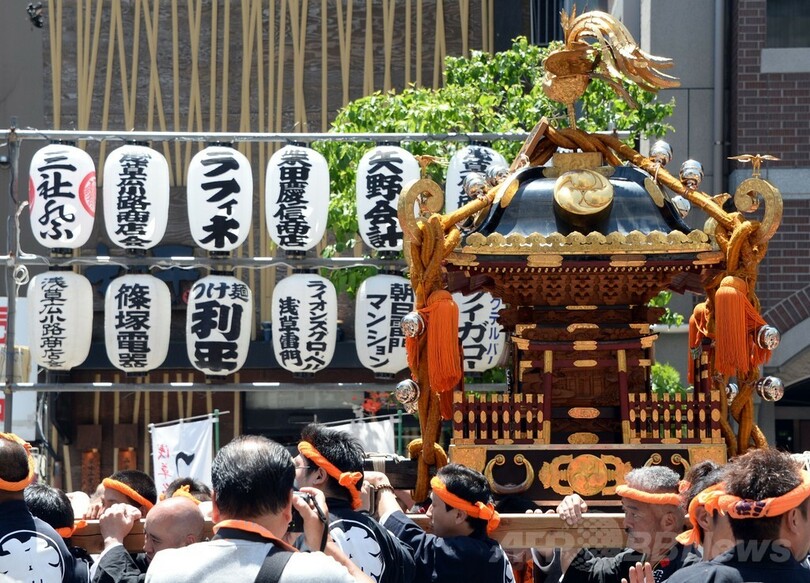 【5月18日 AFP】都内の浅草(Asakusa)では18日、初夏の訪れを告げる恒例の三社祭(Sanja festival)が最終日を迎え、界隈を練り歩くみこしを一目見ようと、大勢の観光客が詰めかけた。三社祭は東京を代表する祭りの一つで、3日間に数百万規模の人出がある。(c)AFP