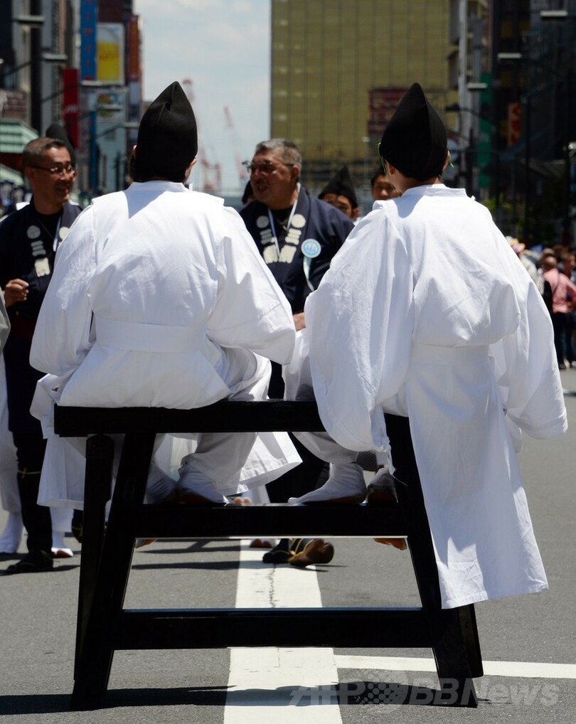 【5月18日 AFP】都内の浅草(Asakusa)では18日、初夏の訪れを告げる恒例の三社祭(Sanja festival)が最終日を迎え、界隈を練り歩くみこしを一目見ようと、大勢の観光客が詰めかけた。三社祭は東京を代表する祭りの一つで、3日間に数百万規模の人出がある。(c)AFP