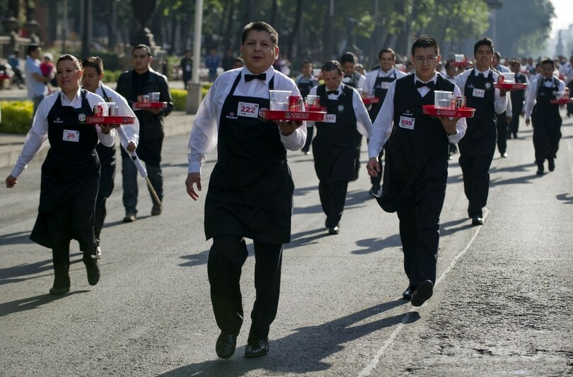 一方、ウエイターたちが挑戦したのは、ドリンクを載せた銀のトレイを800メートル先まで運ぶレースへの参加人数。独立記念塔近くの通りで行われたレースには、337人のウエイターが参加し、世界最多を記録した。(c)AFP