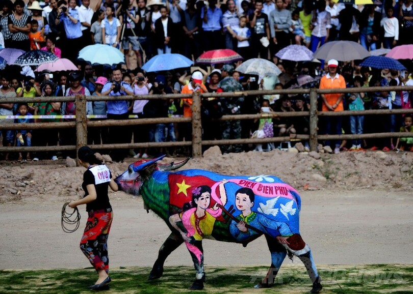 【5月19日 AFP】中国南部・雲南(Yunnan)省の江城(Jiangcheng)で18日、水牛のボディーペインティングを競う大会が開かれた。