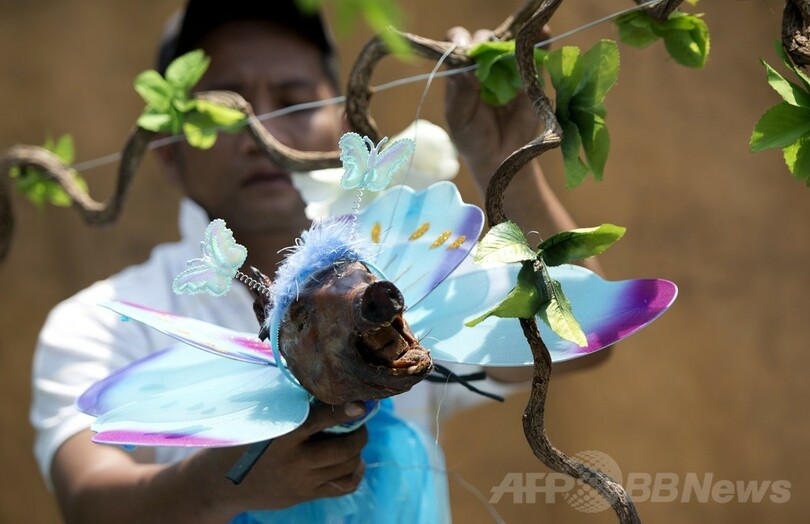 ニュース ライフ こぼれ話 ブタの丸焼きが街を練り歩く、比マニラ 2014年5月19日 17:50 発信地:マニラ/フィリピン [ アジア・オセアニア フィリピン ] このニュースをシェア ‹ › ❮ 4/6 ❯ フィリピン・マニラ(Manila)のラロマ(La Loma)地区で開催されるパレードに向け、妖精の衣装が施されるブタの丸焼き「レチョン(lechon)」(2014年5月18日撮影)。(c)AFP/NOEL CELIS 画像作成中 ! 【5月19日 AFP】フィリピン・マニラ(Manila)のラロマ(La Loma)地区で18日、同地区で開催されるパレードのため、ブタの丸焼き「レチョン(Lechon)」への飾り付けが行われた。パレードでは、ドレスや装飾品が施されたレチョンが街中を練り歩く。 毎年恒例となっているこのイベントでは、「マニラ市内でレチョンを買うならラロマ地区」と言われるほど評判の高いこの名物がユニークなかたちで披露される。(c)AFP ライフ 一覧へ> メディア・報道関係・法人の方向け 写真・動画 購入のお問合せ>