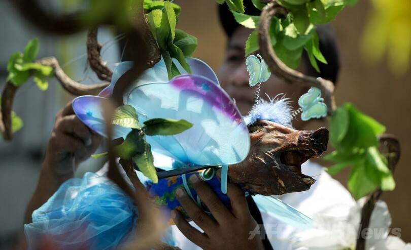 ニュース ライフ こぼれ話 ブタの丸焼きが街を練り歩く、比マニラ 2014年5月19日 17:50 発信地:マニラ/フィリピン [ アジア・オセアニア フィリピン ] このニュースをシェア ‹ › ❮ 3/6 ❯ フィリピン・マニラ(Manila)のラロマ(La Loma)地区で開催されるパレードに向け、妖精の衣装が施されるブタの丸焼き「レチョン(lechon)」(2014年5月18日撮影)。(c)AFP/NOEL CELIS 画像作成中 ! 【5月19日 AFP】フィリピン・マニラ(Manila)のラロマ(La Loma)地区で18日、同地区で開催されるパレードのため、ブタの丸焼き「レチョン(Lechon)」への飾り付けが行われた。パレードでは、ドレスや装飾品が施されたレチョンが街中を練り歩く。 毎年恒例となっているこのイベントでは、「マニラ市内でレチョンを買うならラロマ地区」と言われるほど評判の高いこの名物がユニークなかたちで披露される。(c)AFP ライフ 一覧へ> メディア・報道関係・法人の方向け 写真・動画 購入のお問合せ>