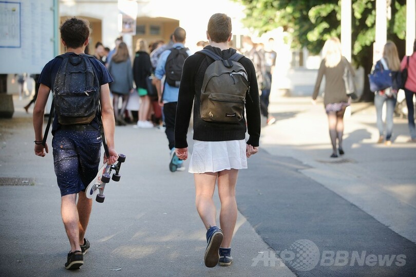 このイベントは、反性差別を掲げる運動「Ce que souleve la jupe(スカートの何が問題?)」の一環として、市の教育当局が承認した学生委員会が呼び掛けた。(c)AFP