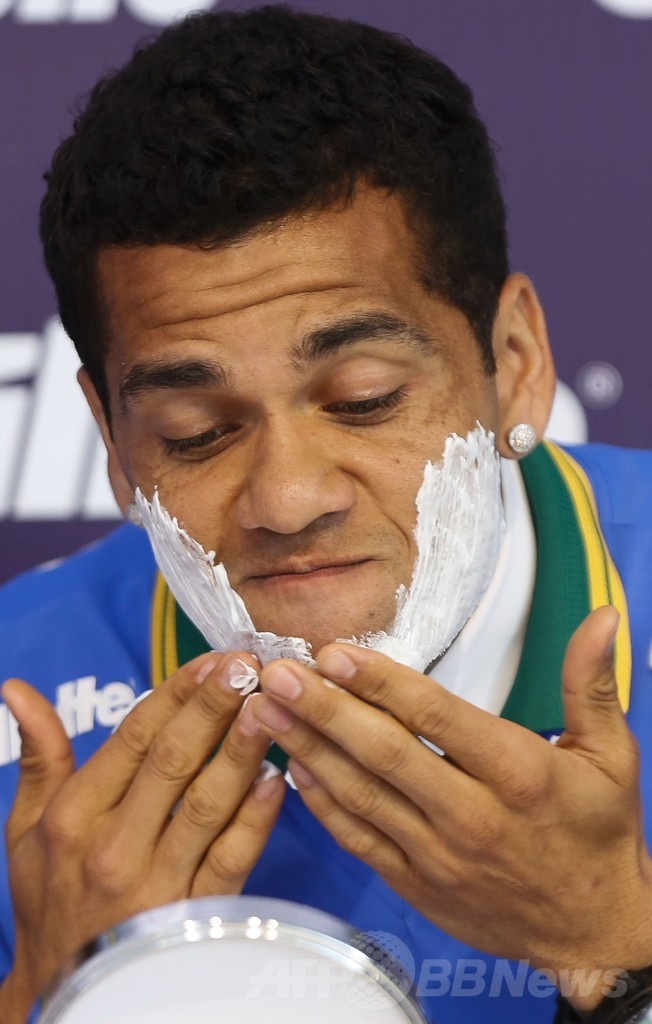 【5月21日 AFP】2014年サッカーW杯ブラジル大会(2014 World Cup)に臨む開催国代表のダニエウ・アウベス(Daniel Alves)、ダビド・ルイス(David Luiz)、パウリーニョ(Jose Paulo Bezerra Maciel Junior 'Paulinho')、オスカル(Oscar dos Santos Emboaba Junior)らが、サンパウロ(Sao Paulo)市内で行われたイベントに出席し、ひげをそった。(c)AFP