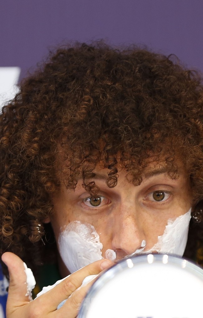 【5月21日 AFP】2014年サッカーW杯ブラジル大会(2014 World Cup)に臨む開催国代表のダニエウ・アウベス(Daniel Alves)、ダビド・ルイス(David Luiz)、パウリーニョ(Jose Paulo Bezerra Maciel Junior 'Paulinho')、オスカル(Oscar dos Santos Emboaba Junior)らが、サンパウロ(Sao Paulo)市内で行われたイベントに出席し、ひげをそった。(c)AFP