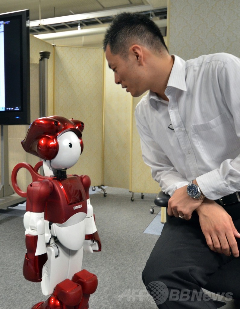 赤白ボディーのEMIEW2は身長80センチで、搭載された車輪を使って移動する。(c)AFP