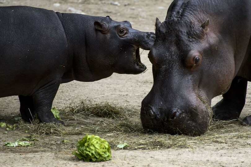 母親といつも一緒、コビトカバの赤ちゃん スイス