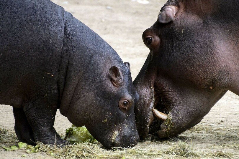 母親といつも一緒、コビトカバの赤ちゃん スイス