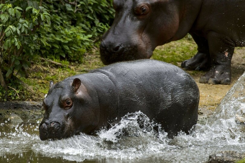 母親といつも一緒、コビトカバの赤ちゃん スイス