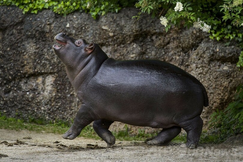 母親といつも一緒、コビトカバの赤ちゃん スイス