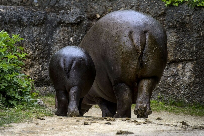 【5月22日 AFP】スイス・バーゼル(Basel)のバーゼル動物園(Basel Zoo)で、コビトカバの赤ちゃん「ラニ(Lani)」が、晴れた暖かな日に屋外の展示施設で母親の「アシャキ(Ashaki)」と仲むつまじい姿をみせている。