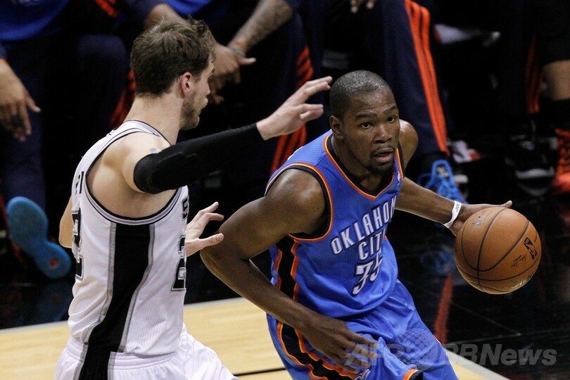 今季の最優秀選手(MVP)に輝いたデュラントは、ウエストブルックとともにそれぞれ15得点にとどまった。それ以外に先発した3人の選手も合計4得点に終わっている。(c)AFP